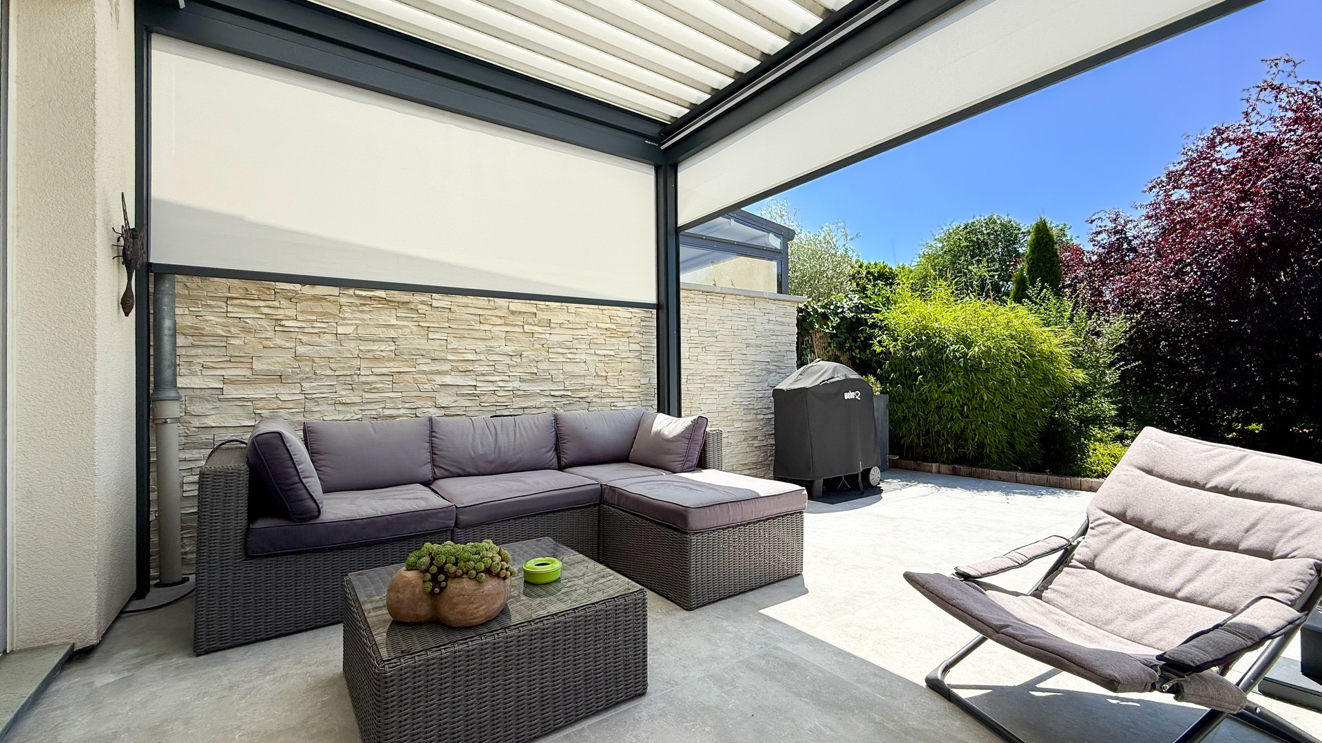 Accès direct à une belle terrasse avec pergola, menant à un grand jardin arboré et parfaitement privé.