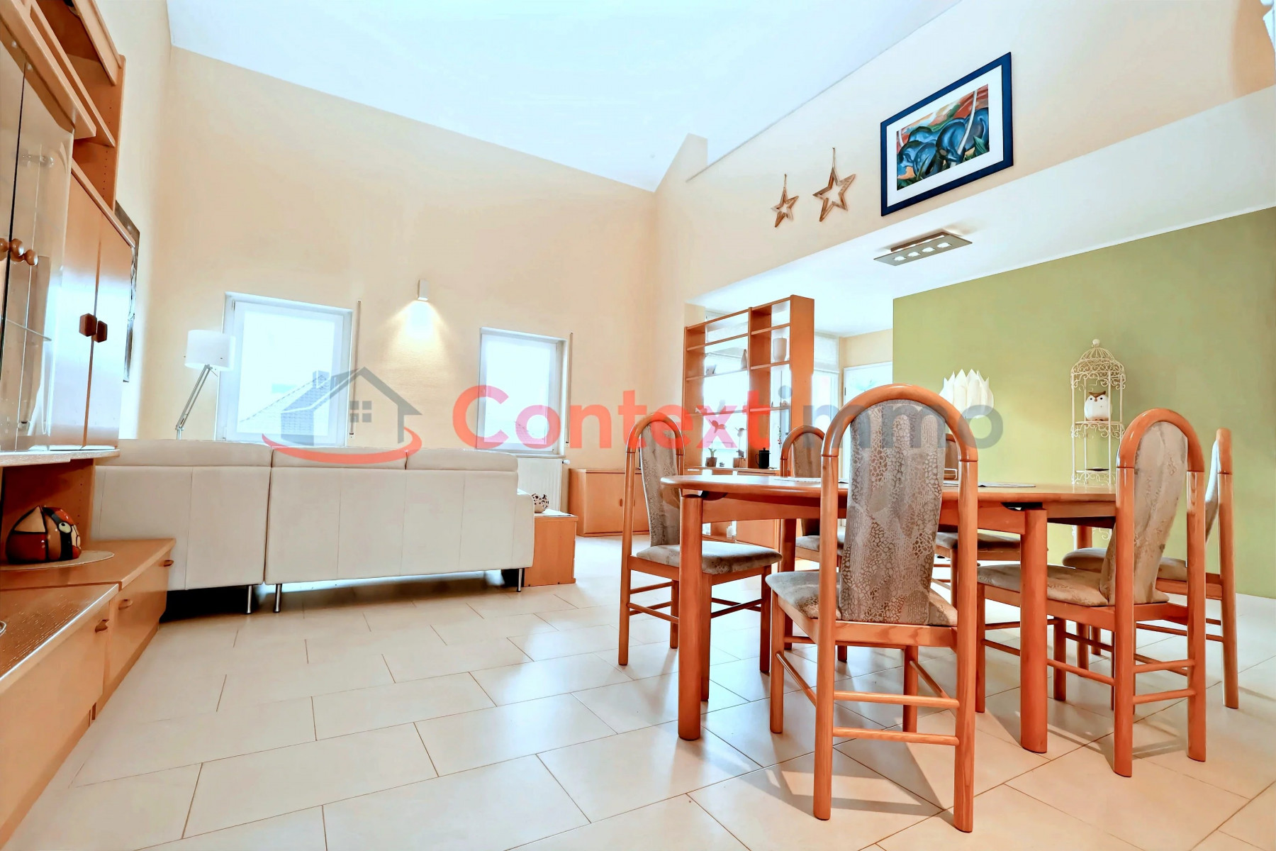 Helles Wohnzimmer mit Esszimmer und außergewöhnlicher Deckenhöhe.