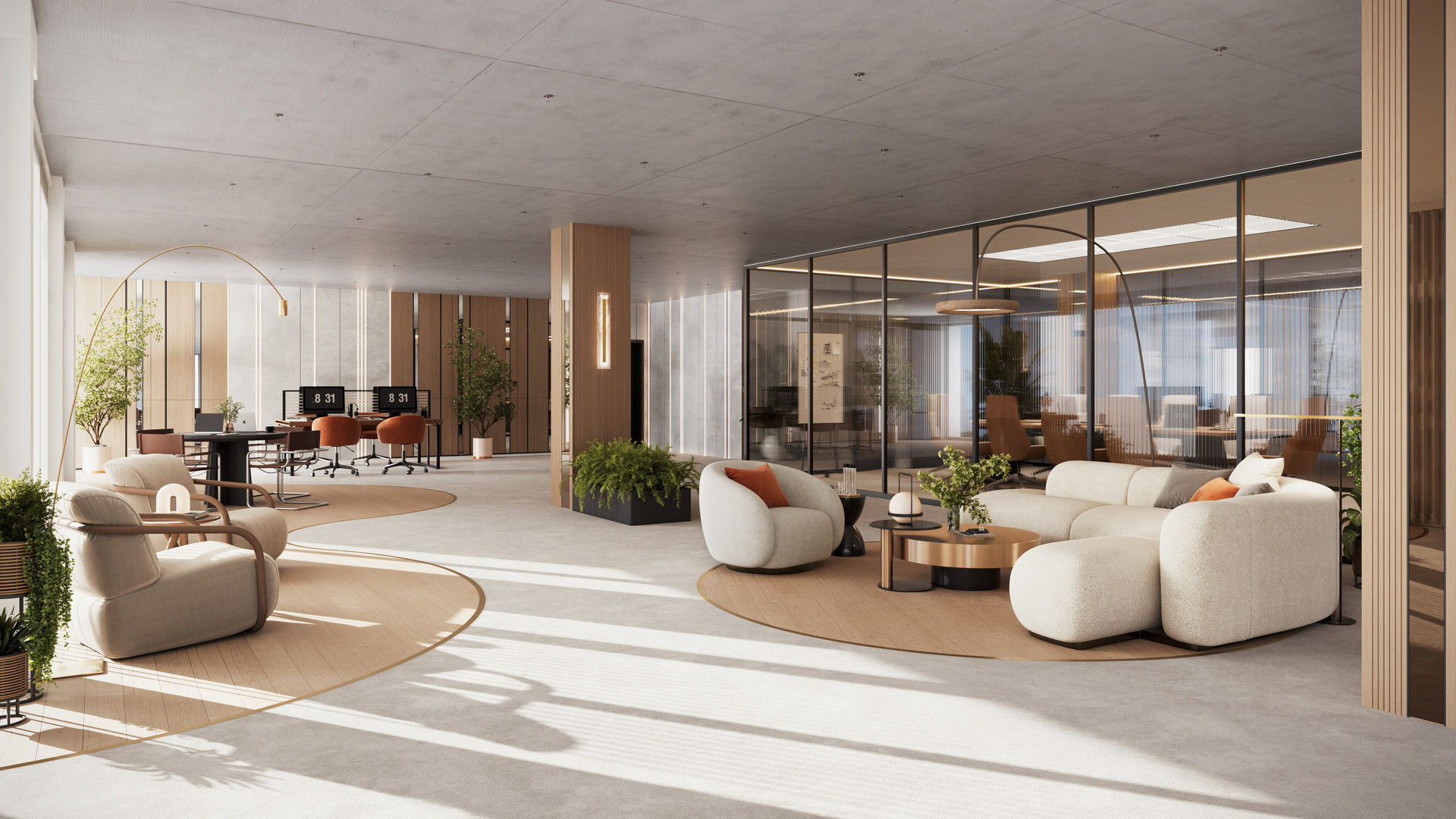 Whether it entails rearranging desks for team projects or creating quiet zones for individual work, the office environment will accommodate various work scenarios, such as the possibility of arranging a coworking area in the atrium.