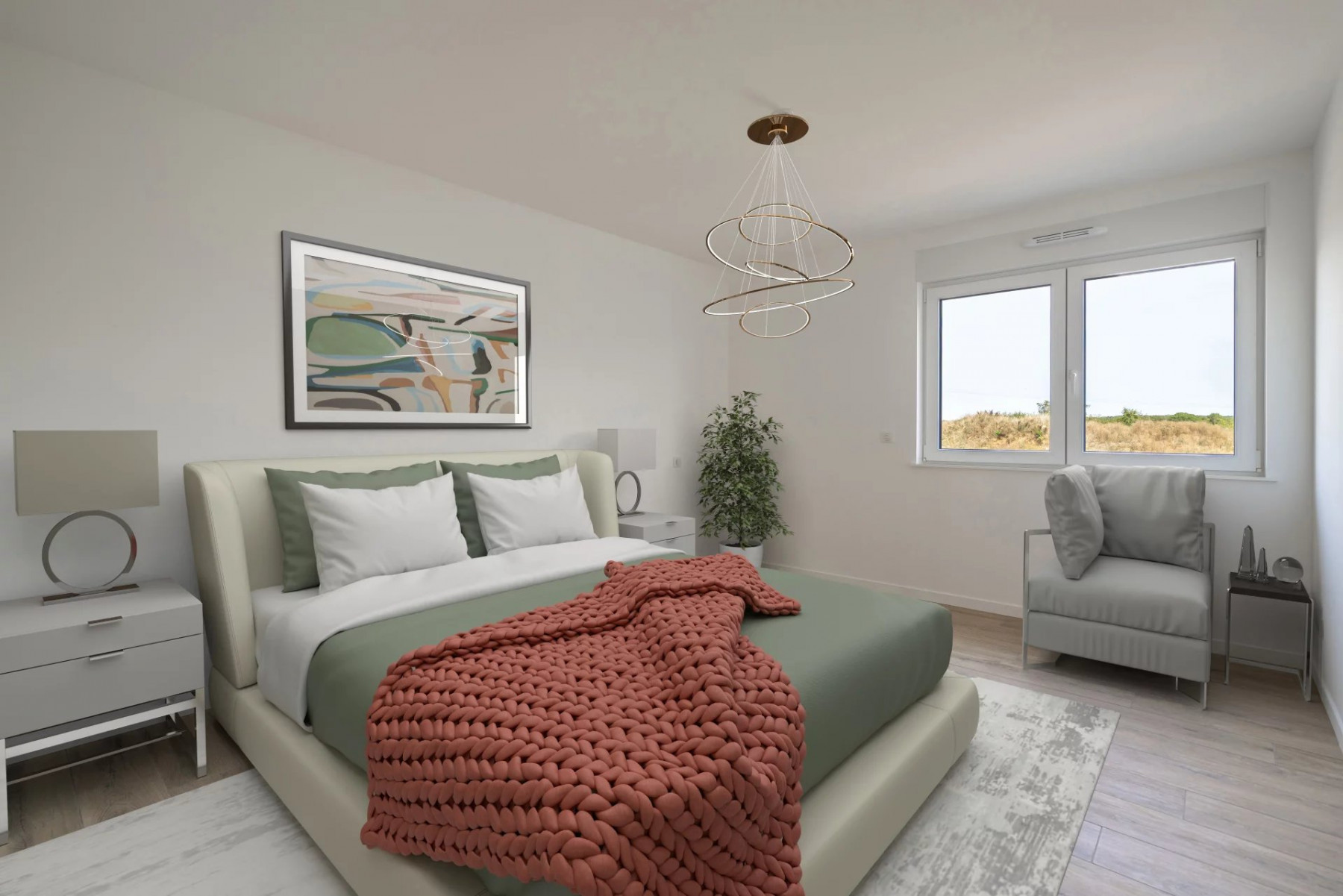 Il se compose d’un séjour lumineux avec accès à une terrasse de 33,20 m², d’une cuisine équipée ouverte incluse dans le prix (avec possibilité de personnaliser le revêtement), de deux chambres confortables, d’une salle de bains contemporaine et d’un toilette séparé.