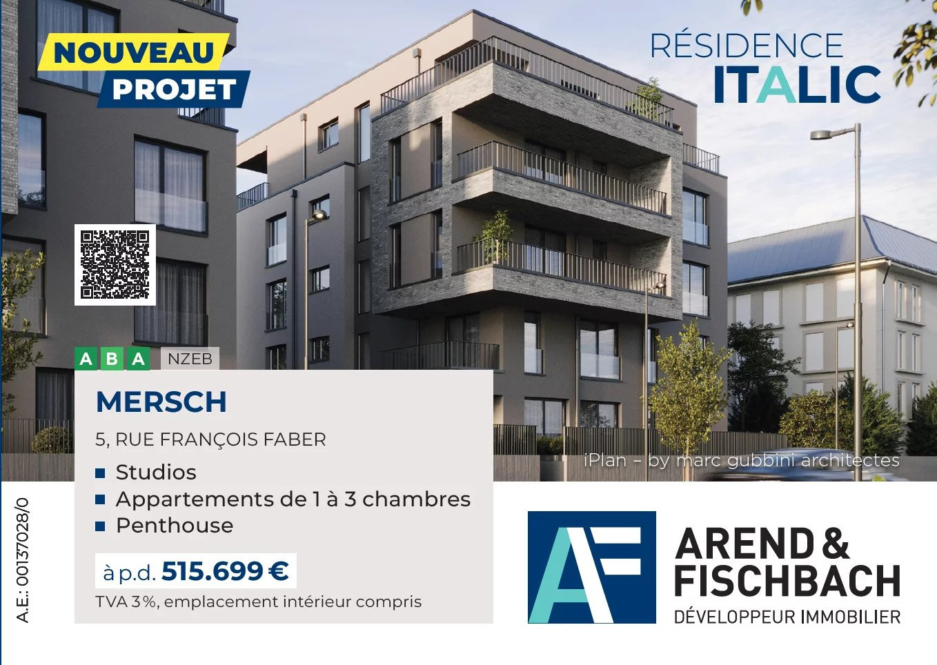 La résidence «ITALIC» se situe à Mersch, 5, rue François Faber dans le nouveau lotissement «Rue des Prés». Elle sera implantée sur un terrain de ca. 7,29 ares.