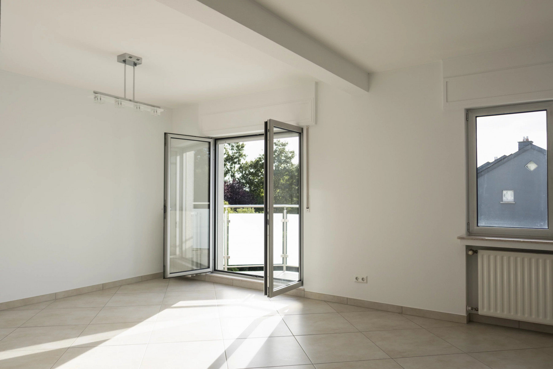 Helles, großzügiges Wohnzimmer mit großen Fenstern und zwei Balkonen: