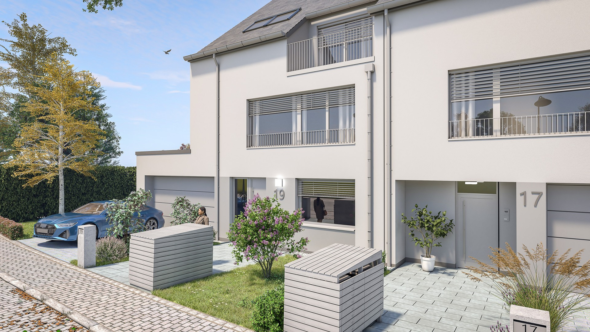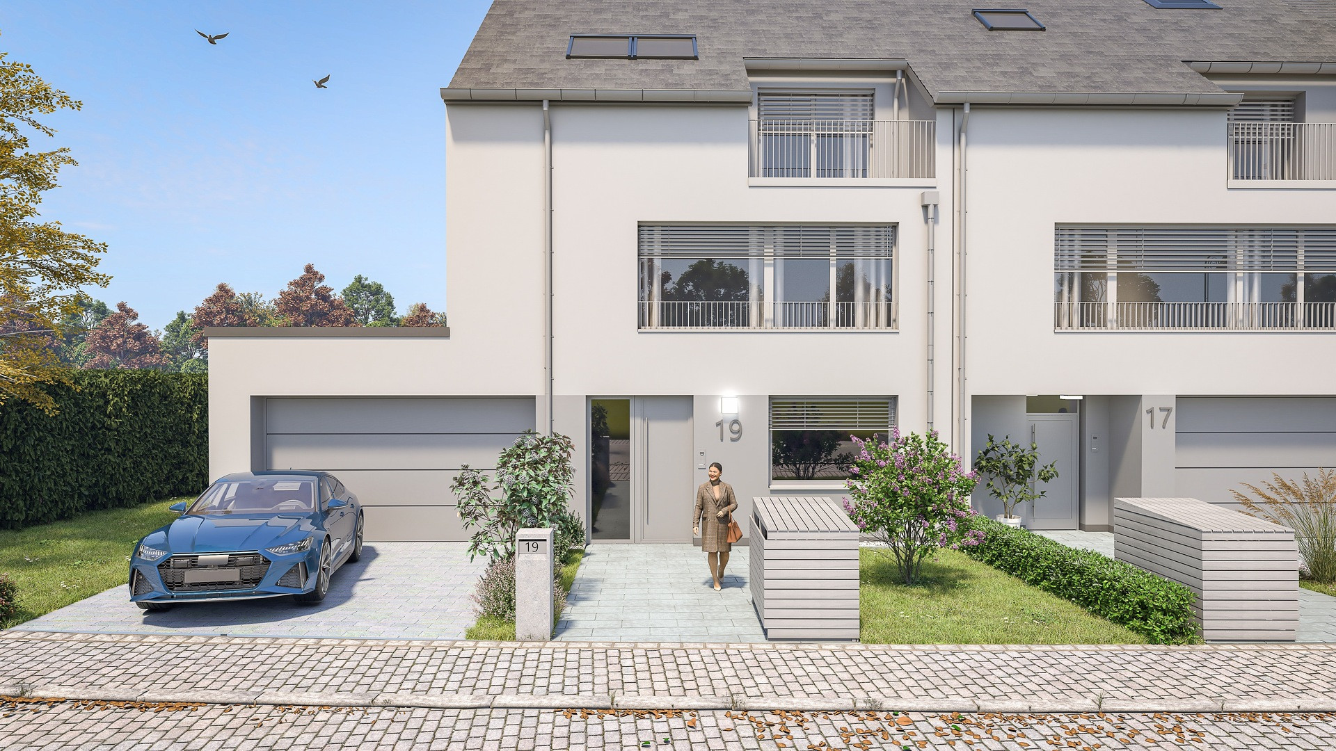 Construction clés en main comprenant des fenêtres en ALU avec RAF-Stores (Lamelles), l'aménagement des alentours comme les entrées à l'immeuble, terrasse, bordures, etc... et la mise en peinture intérieure.