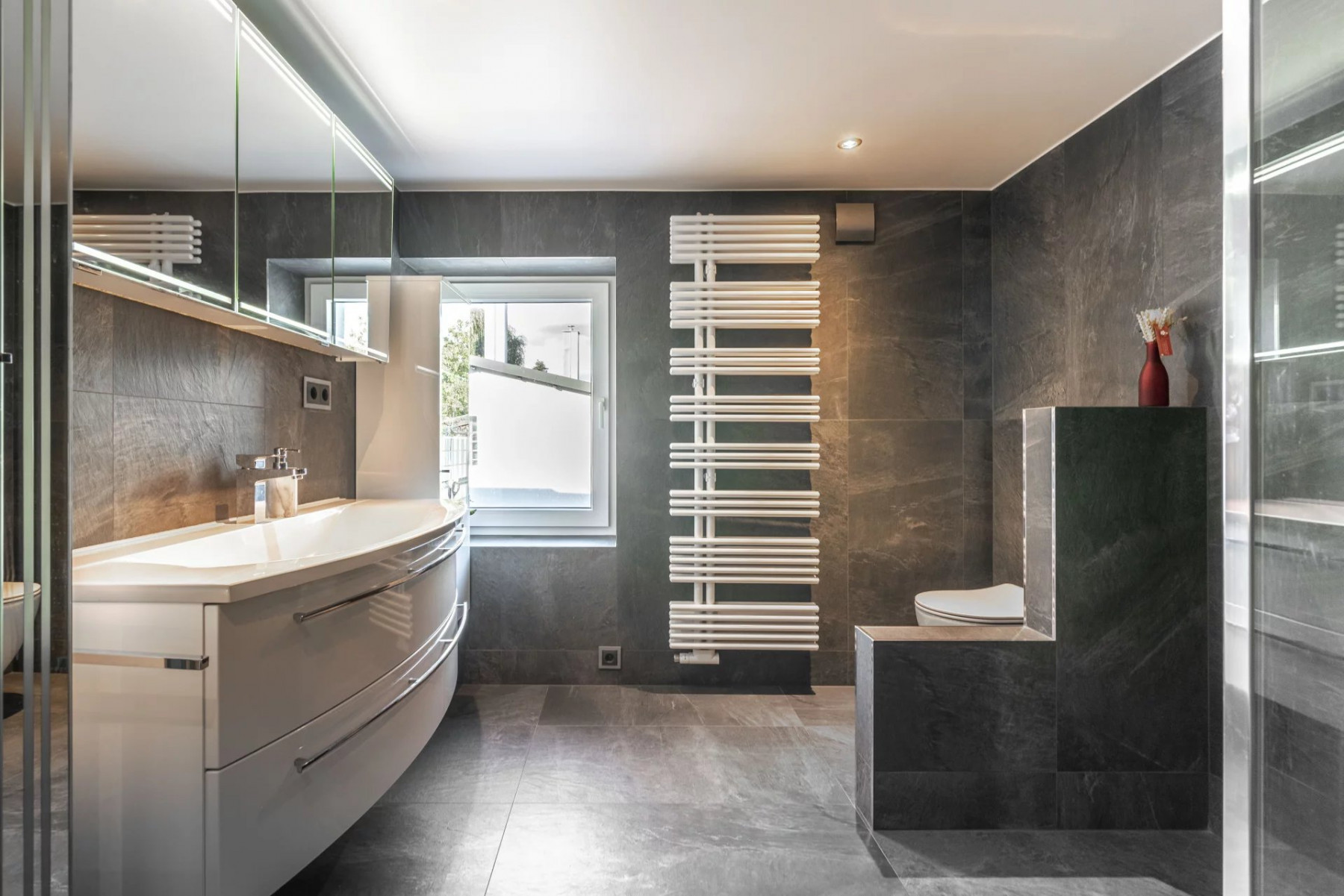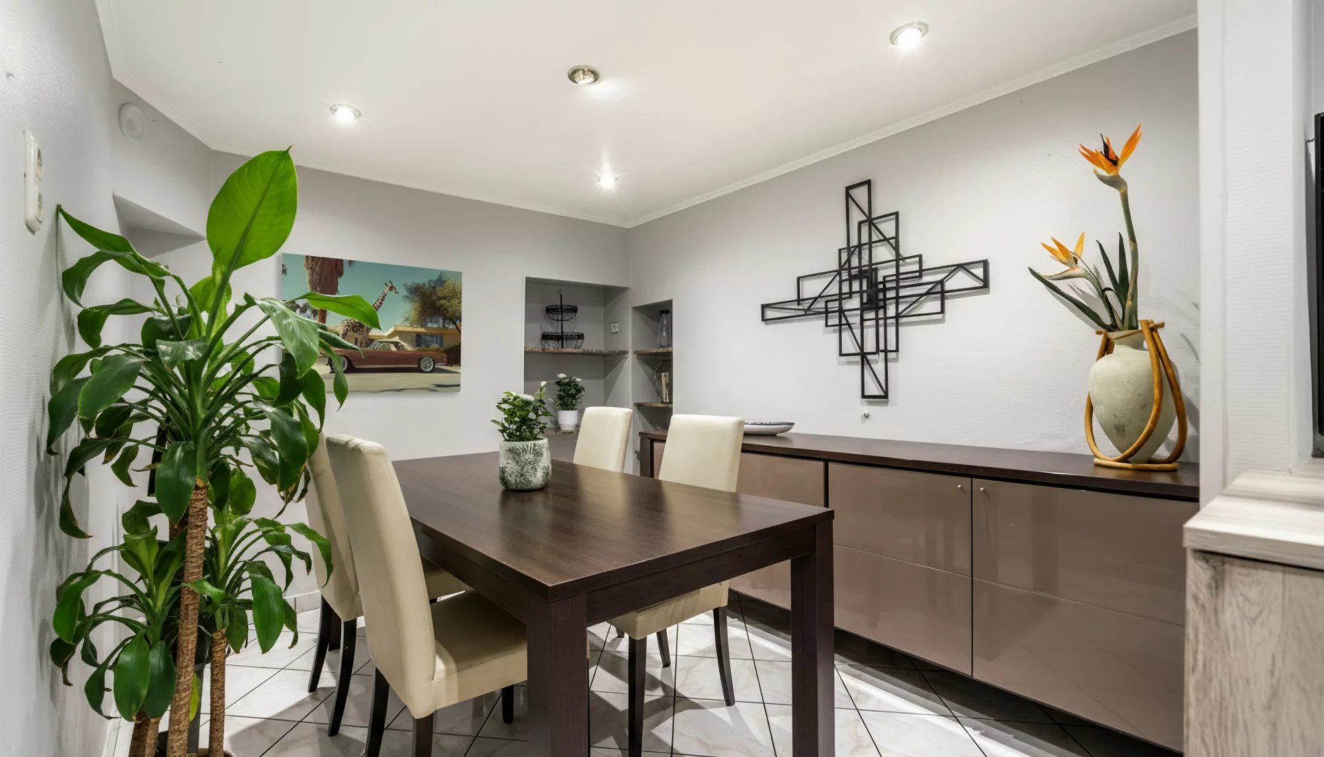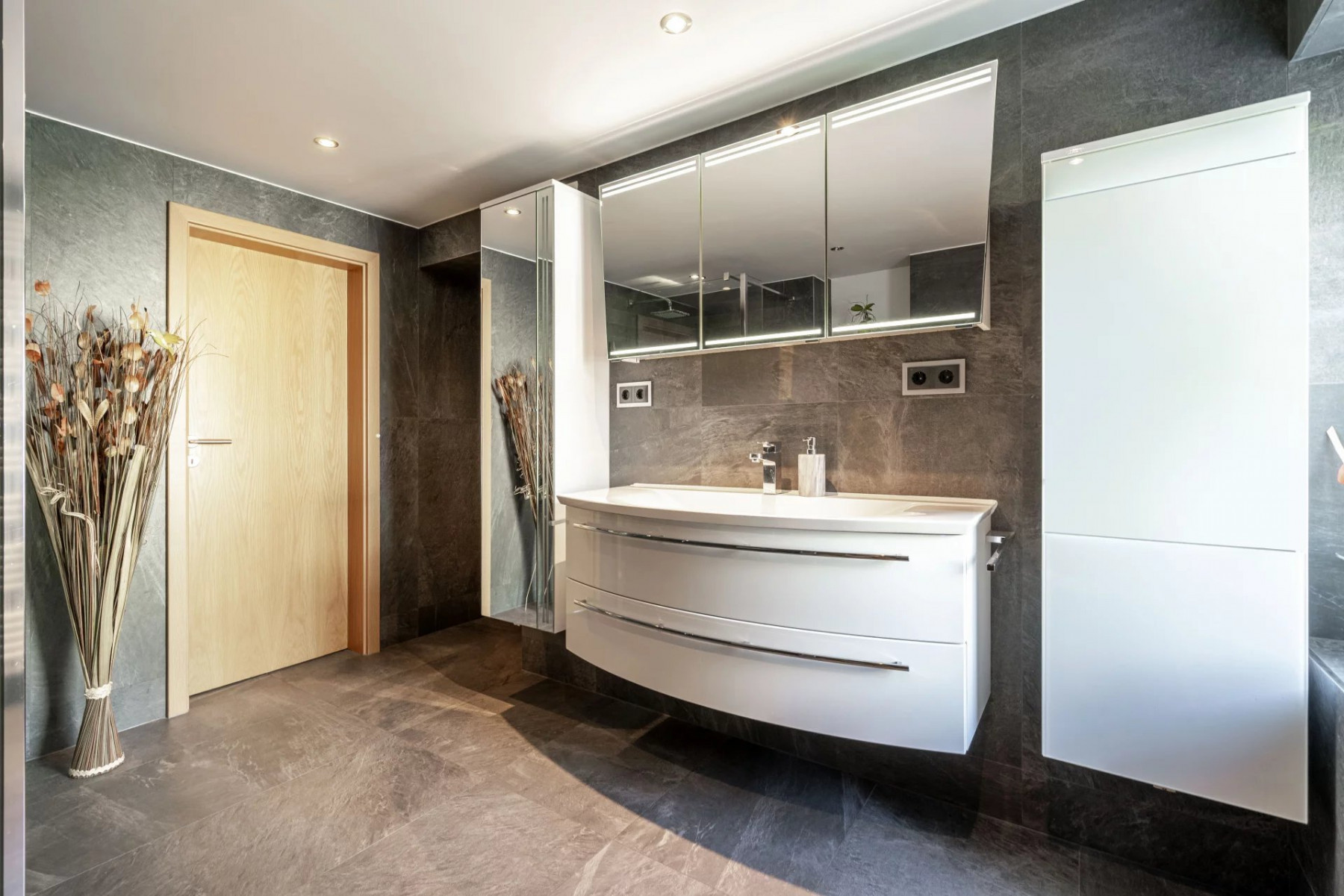 Le rez-de-chaussée comprend également une salle de bains, parfaitement pensée pour le quotidien et particulièrement pratique pour ceux qui profitent de la piscine. À l’étage, un grand hall dessert trois chambres confortables, ainsi qu’une salle de bains rénovée, aux matériaux contemporains et au design sobre et élégant.