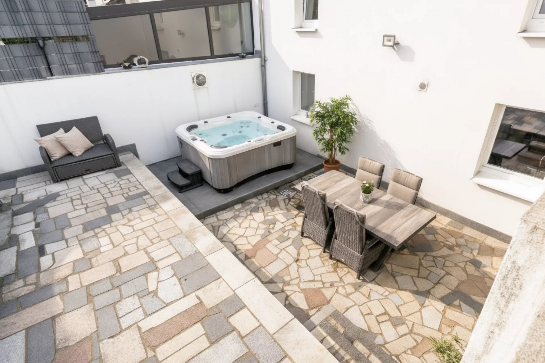 À l’extérieur, la maison dévoile un espace de vie en plein air remarquable. La grande terrasse pavée, idéalement exposée, accueille un coin repas, un jacuzzi et une piscine hors-sol, dans un environnement intime et facile d’entretien. Un garage fermé pour une voiture ainsi que plusieurs emplacements extérieurs pouvant accueillir jusqu’à quatre véhicules complètent cet ensemble.