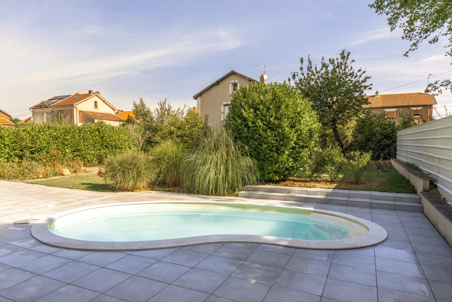 À l’extérieur, le jardin clos et paysager accueille une belle piscine avec terrasse carrelée. Deux à quatre véhicules peuvent stationner aisément sur l’espace extérieur. Une cave complète ce bien.