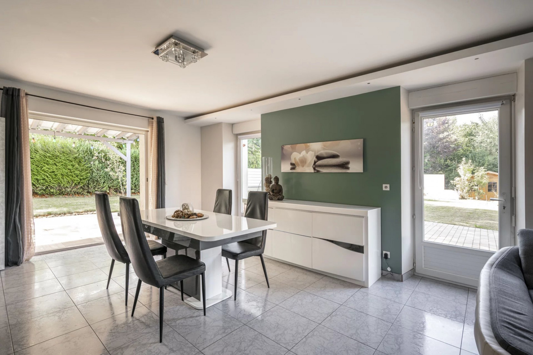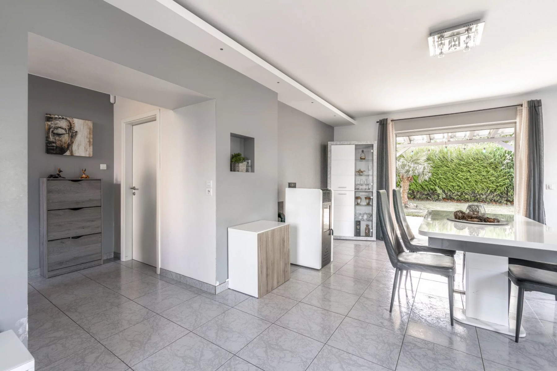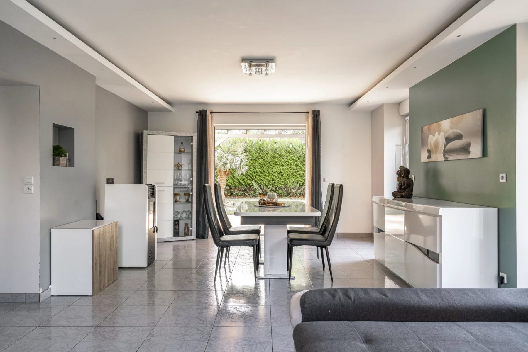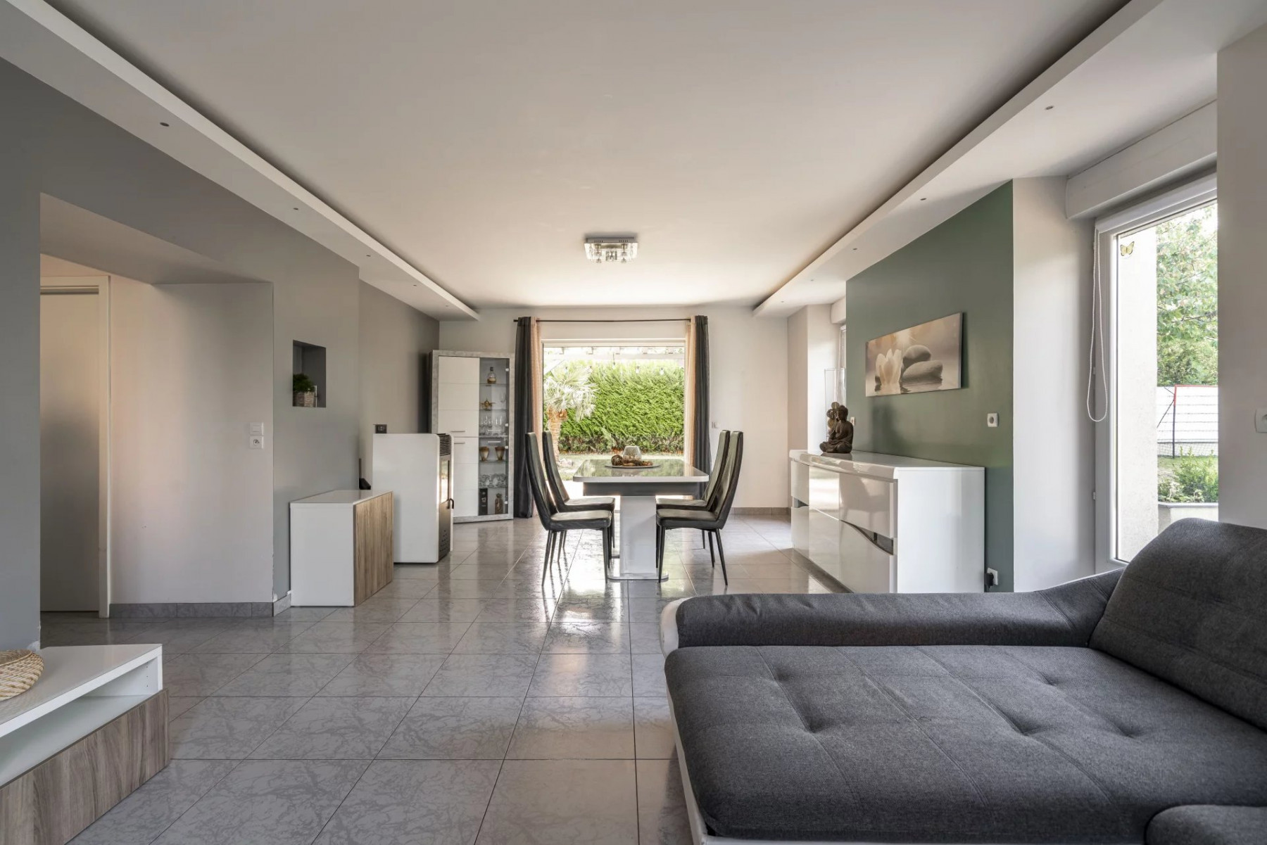 Le confort est assuré par une pompe à chaleur récente (2023), des fenêtres PVC double vitrage et une performance énergétique en classe C. Les sols mêlant carrelage et parquet apportent élégance et praticité.