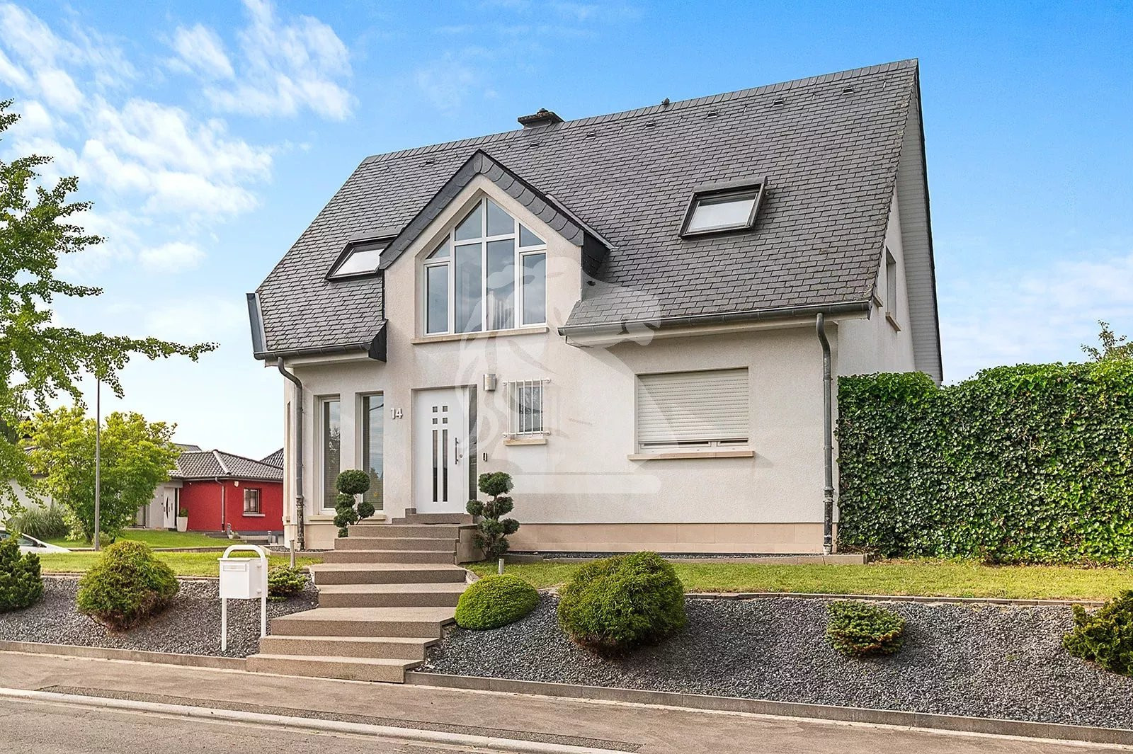De larges paliers de pierres grises mènent à l'entrée de cette maison qui se compose d'un rez-de-chaussée, d'un étage et d'un sous-sol.