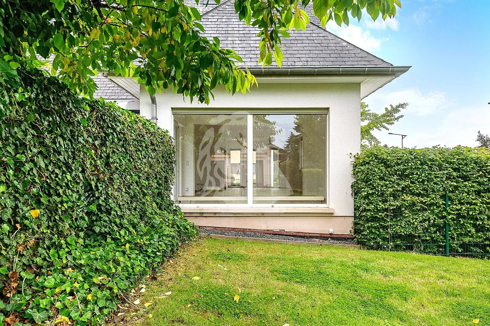 Le jardin arboré bien entretenu est délimité par une belle haie. Un chalet en bois permet d'entreposer le matériel d'entretien.