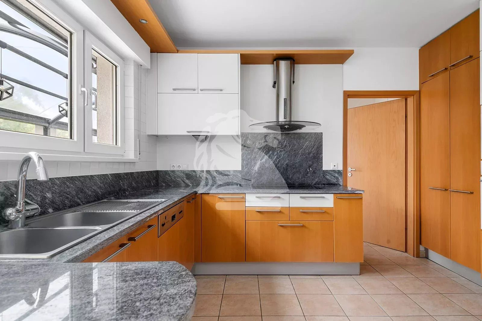 The ground floor features a spacious entrance hall, which opens through double glass doors into the living room. From here, you have access to the kitchen and its adjoining laundry room, the covered terrace, and the garden.