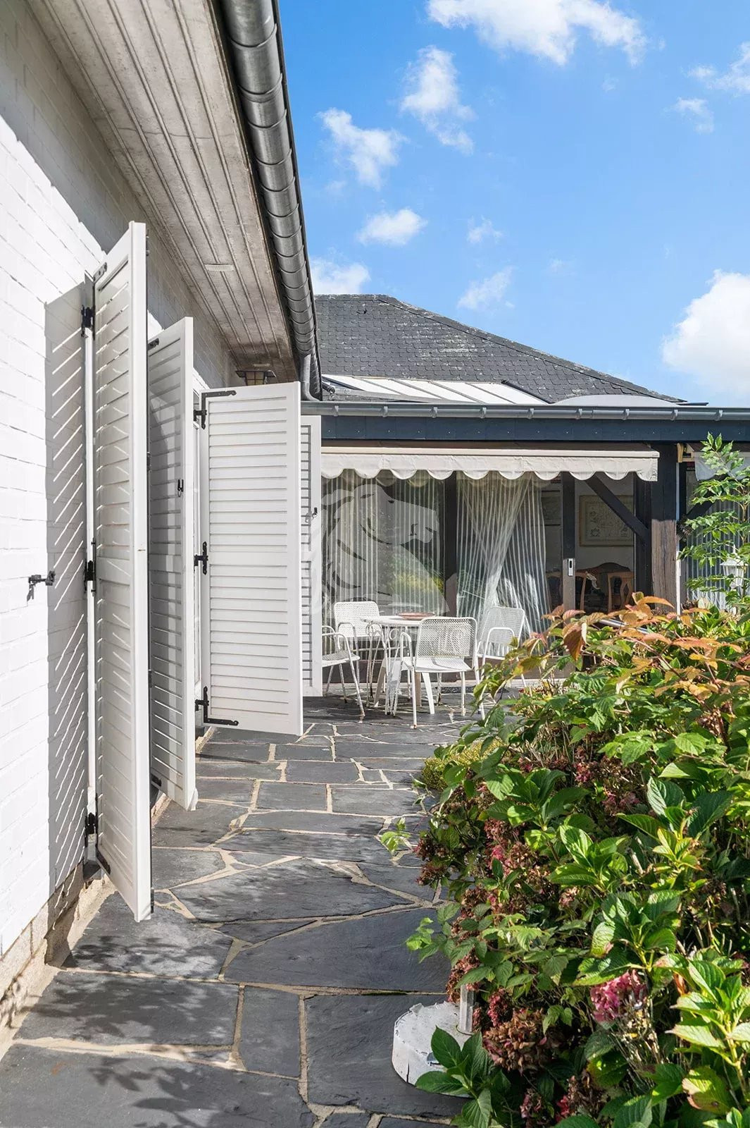 Deux entrées sont possibles, à savoir, une située sur le côté (qui fût la 1ère entrée lors de la construction de départ en 1970) ainsi qu’une seconde porte en façade (qui fût ajoutée lors de l'extension de la maison suite à l’achat du terrain voisin).