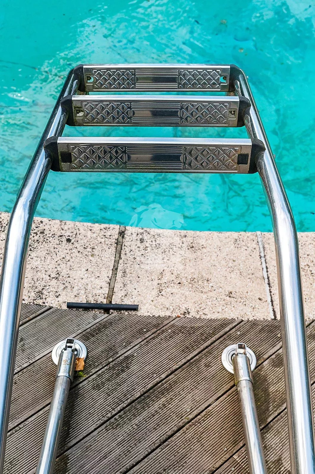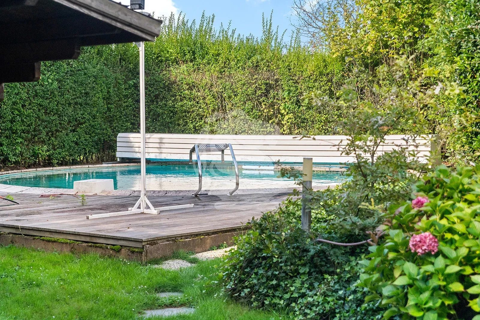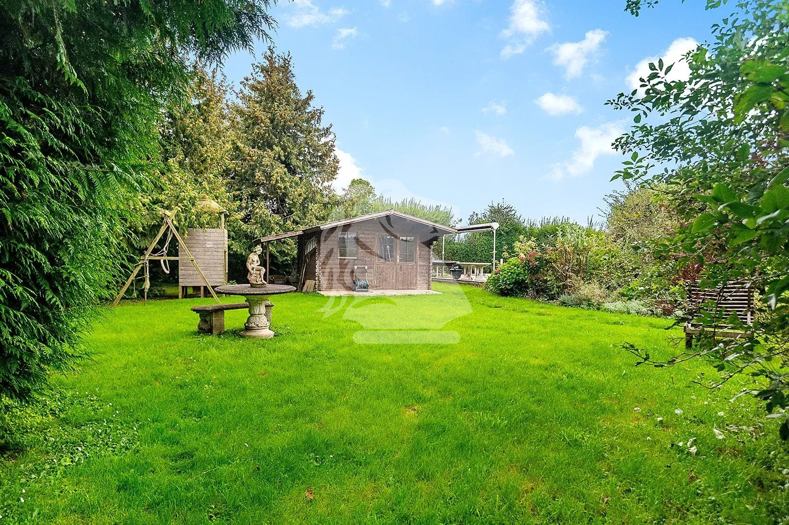 The garden, adorned with hedges, a circular pool, a garden shed, and a play area with a wooden swing set, offers peace and privacy.