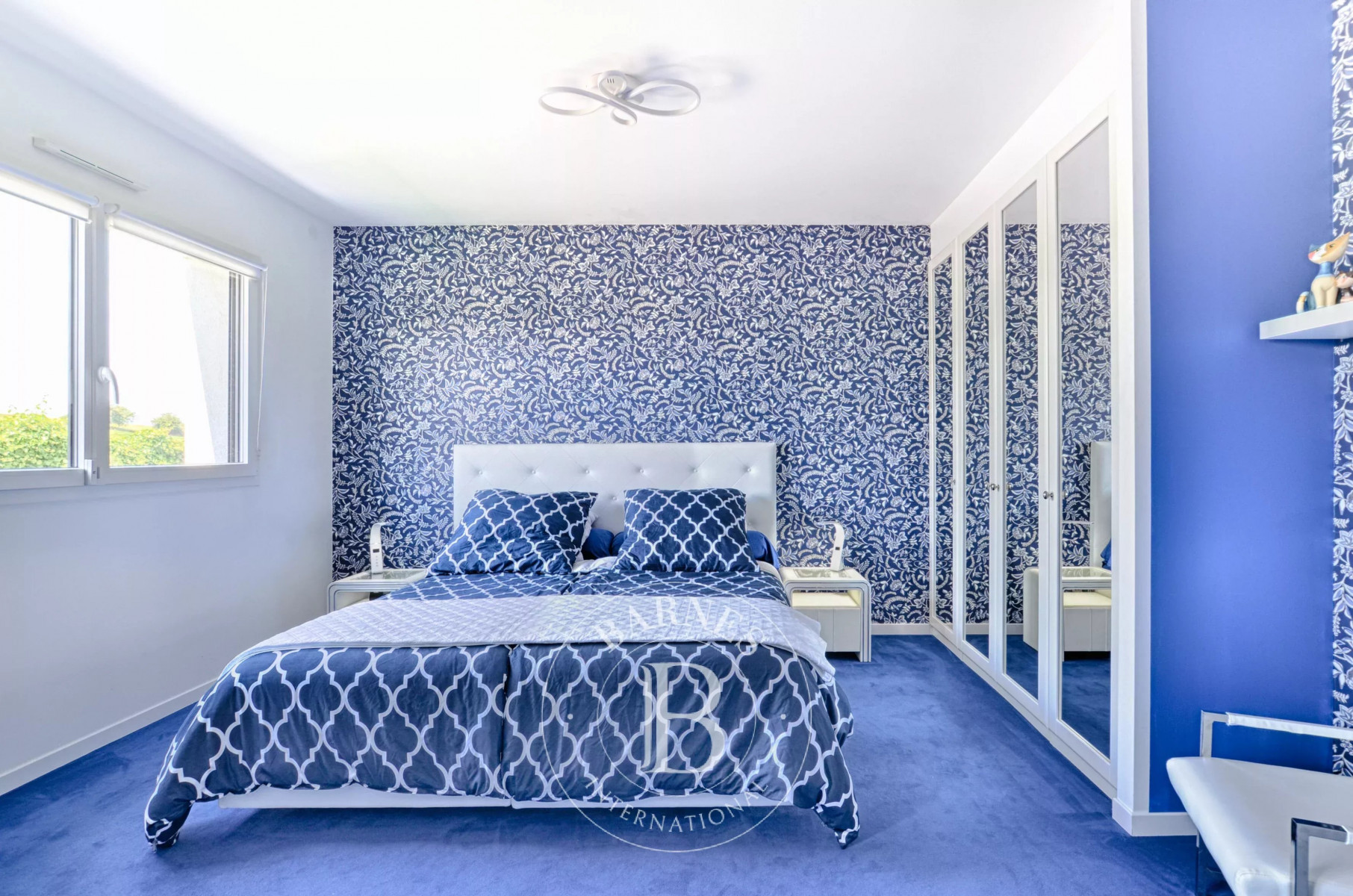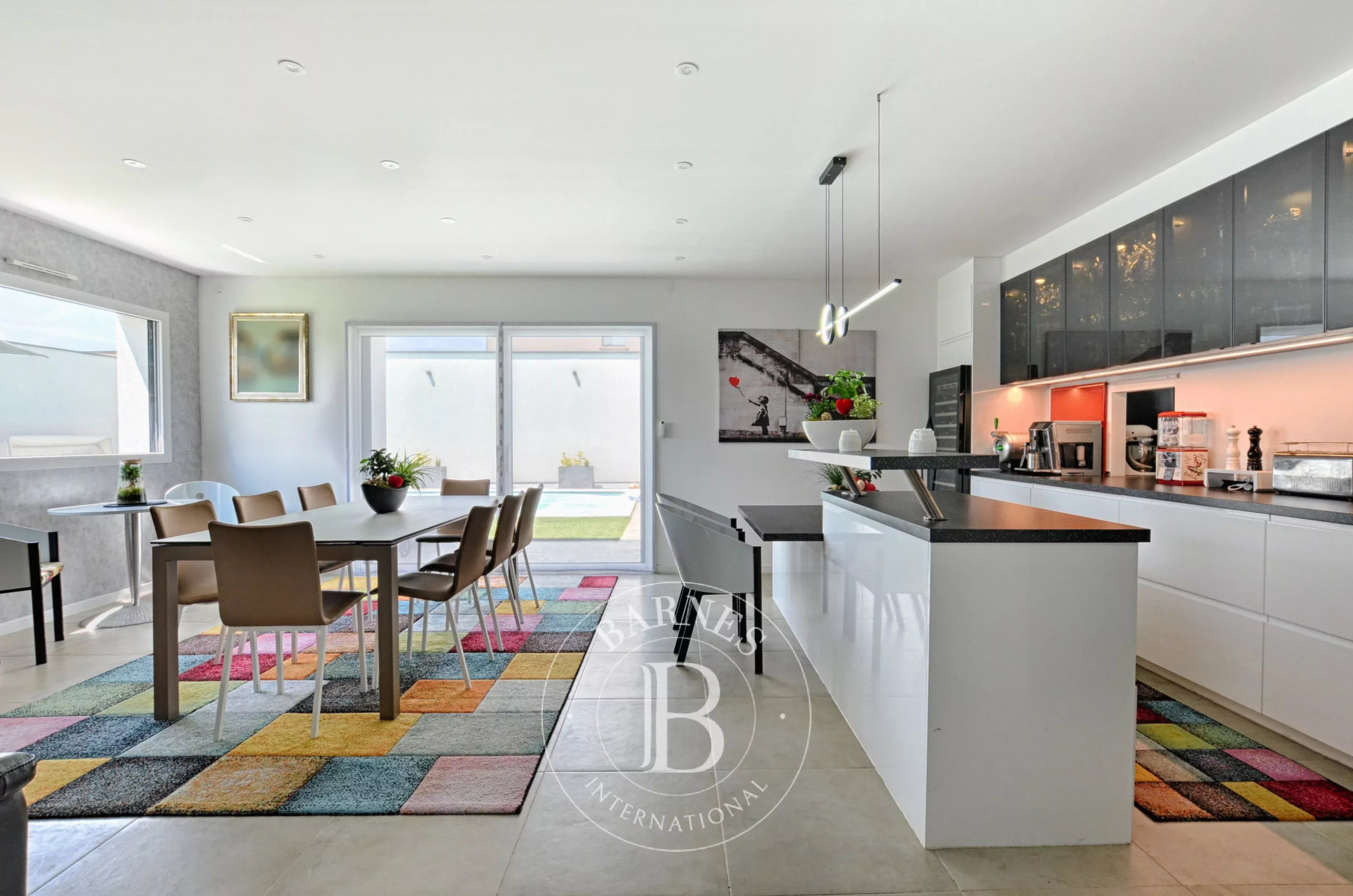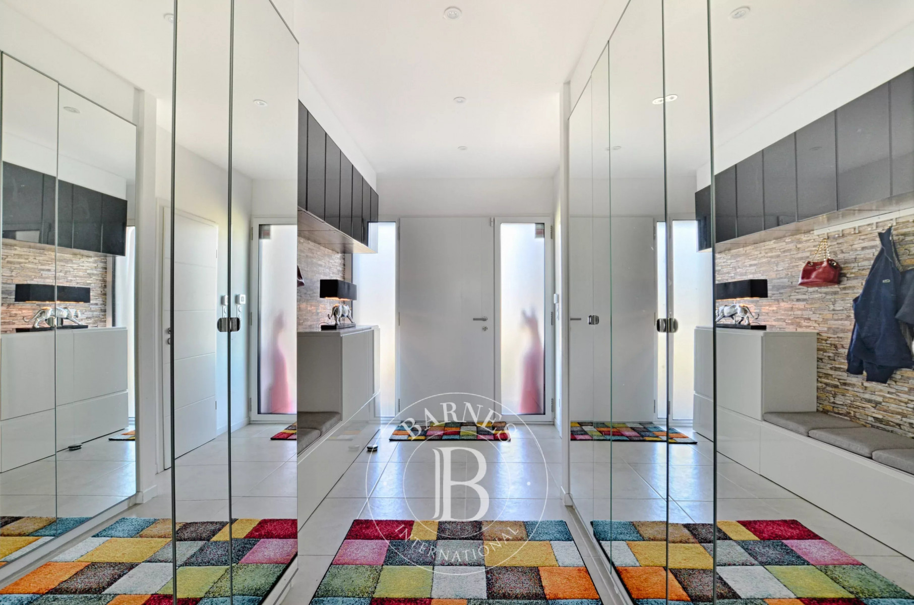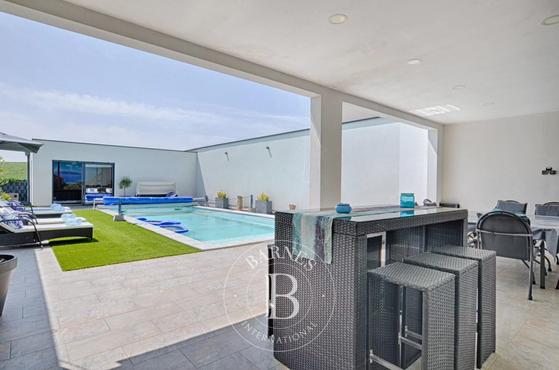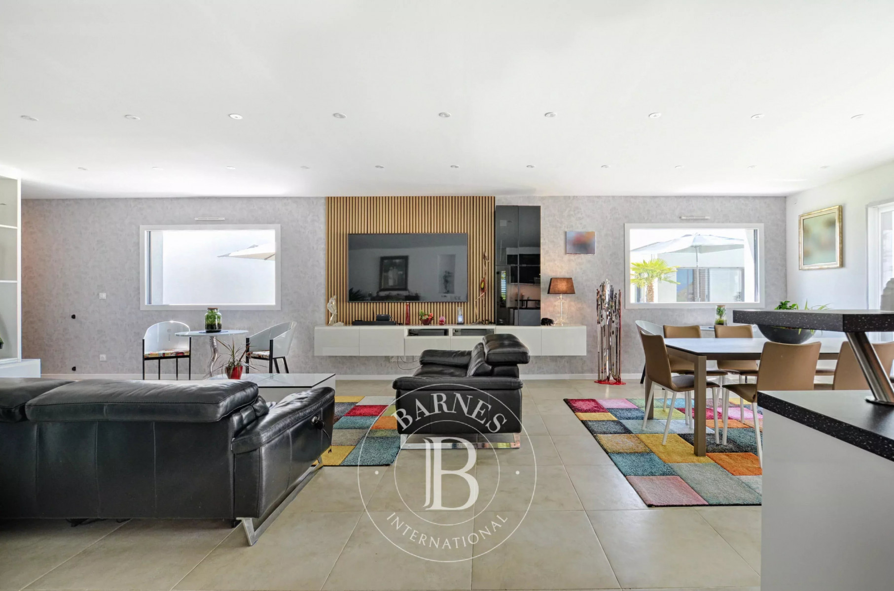 un hall d'entrée avec des placards incorporés de haut de gamme, un toilettes d'hôtes, un double salon salle à manger et son bar avec un accès direct sur le jardin et la piscine extérieure. Une cuisine équipée et son cellier avec un accès sur une vaste terrasse abritée, une suite parentale avec son dressing, sa salle de douche et WC.