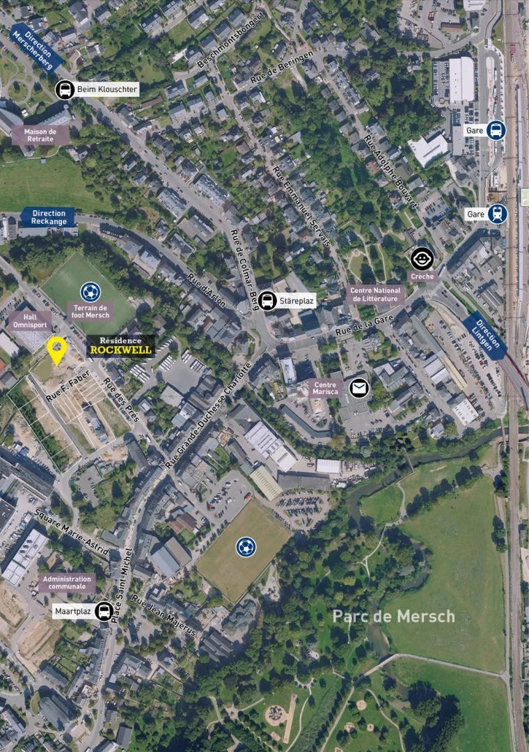Mersch profite d’une situation idéale au centre du pays. La résidence «Rockwell» est située à proximité des centres commerciaux, supermarchés et magasins du Merscherberg.