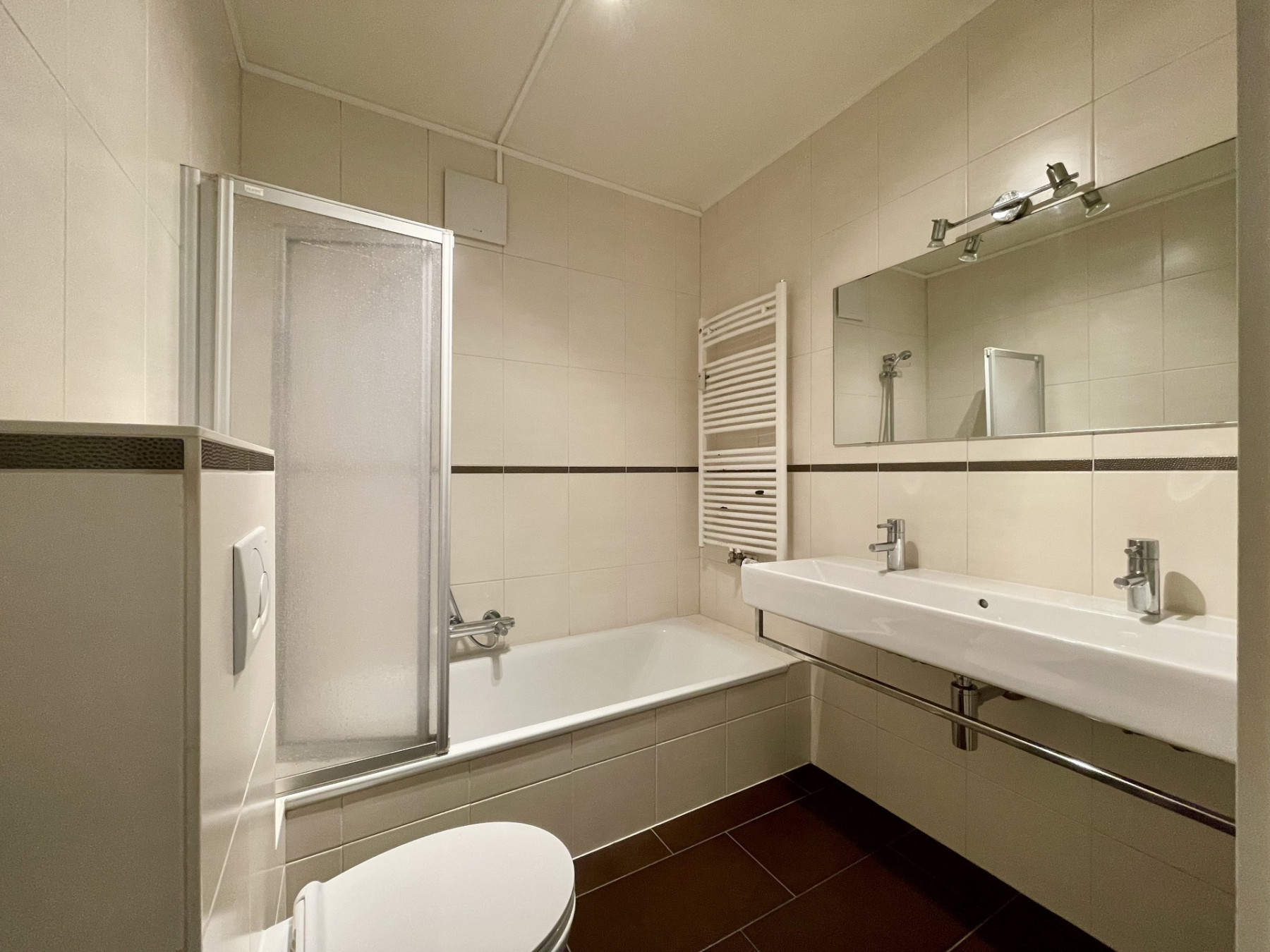 Salle de bains avec baignoire/douche, double vasque et WC,