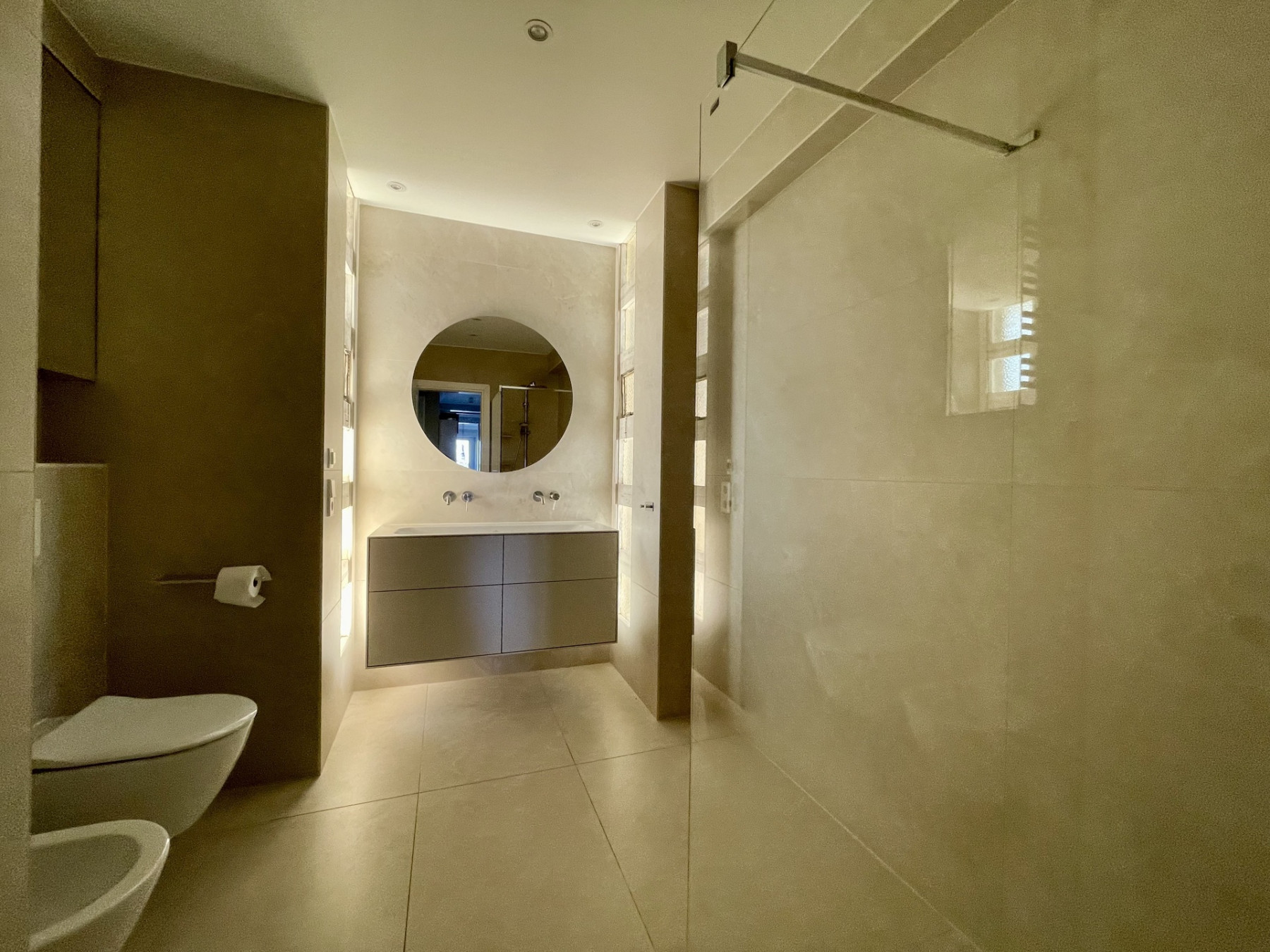 The sleeping area features three comfortable bedrooms (16.40 m², 15.40 m², 10.36 m²), two contemporary shower rooms and a separate toilet. One of the bedrooms offers access to a second balcony (±8.60 m²) with a breathtaking view of the Limpertsberg.