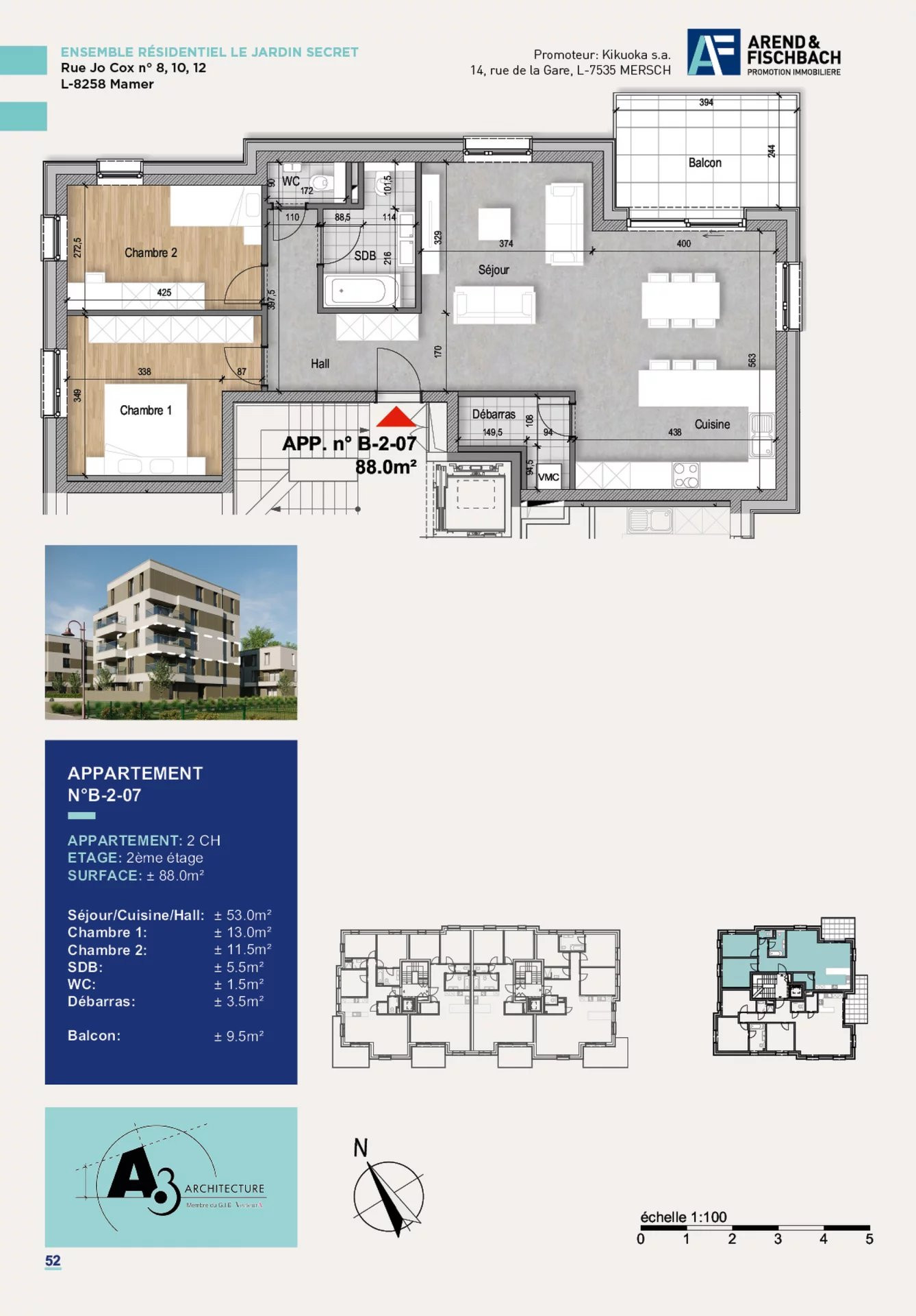 L'appartement B-2-07 de 88,21 m2 se compose comme suit :