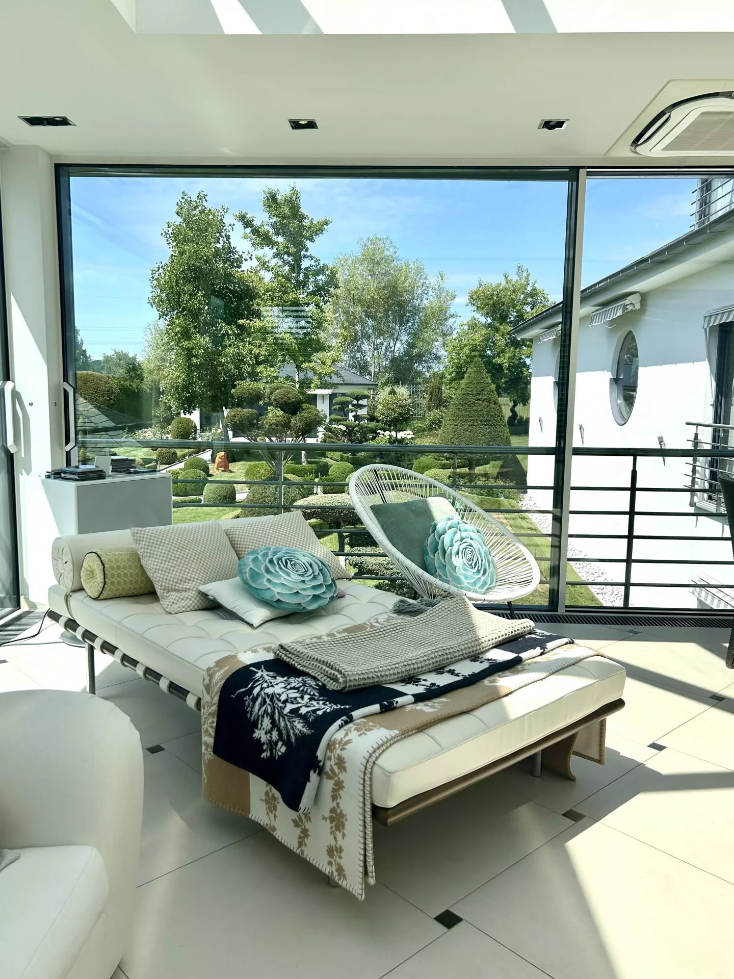 un superbe espace de vie baigné de lumière : salon séjour salle à manger avec une vue magnifique sur le jardin.