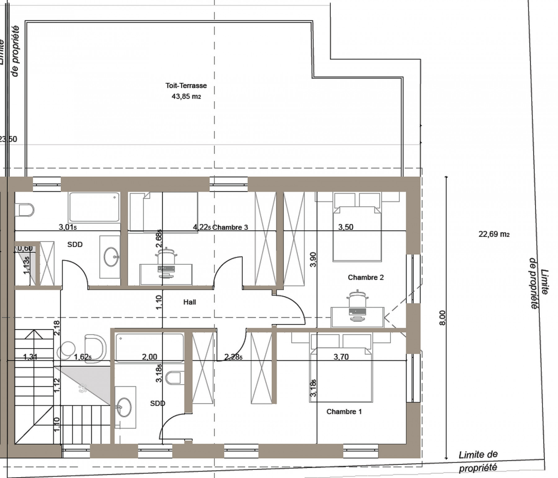 À l'étage, un hall de nuit dessert trois chambres bien proportionnées, deux salles de douche modernes, ainsi qu'une superbe toit-terrasse de 44 m², idéale pour profiter d'un espace extérieur privé et ensoleillé.