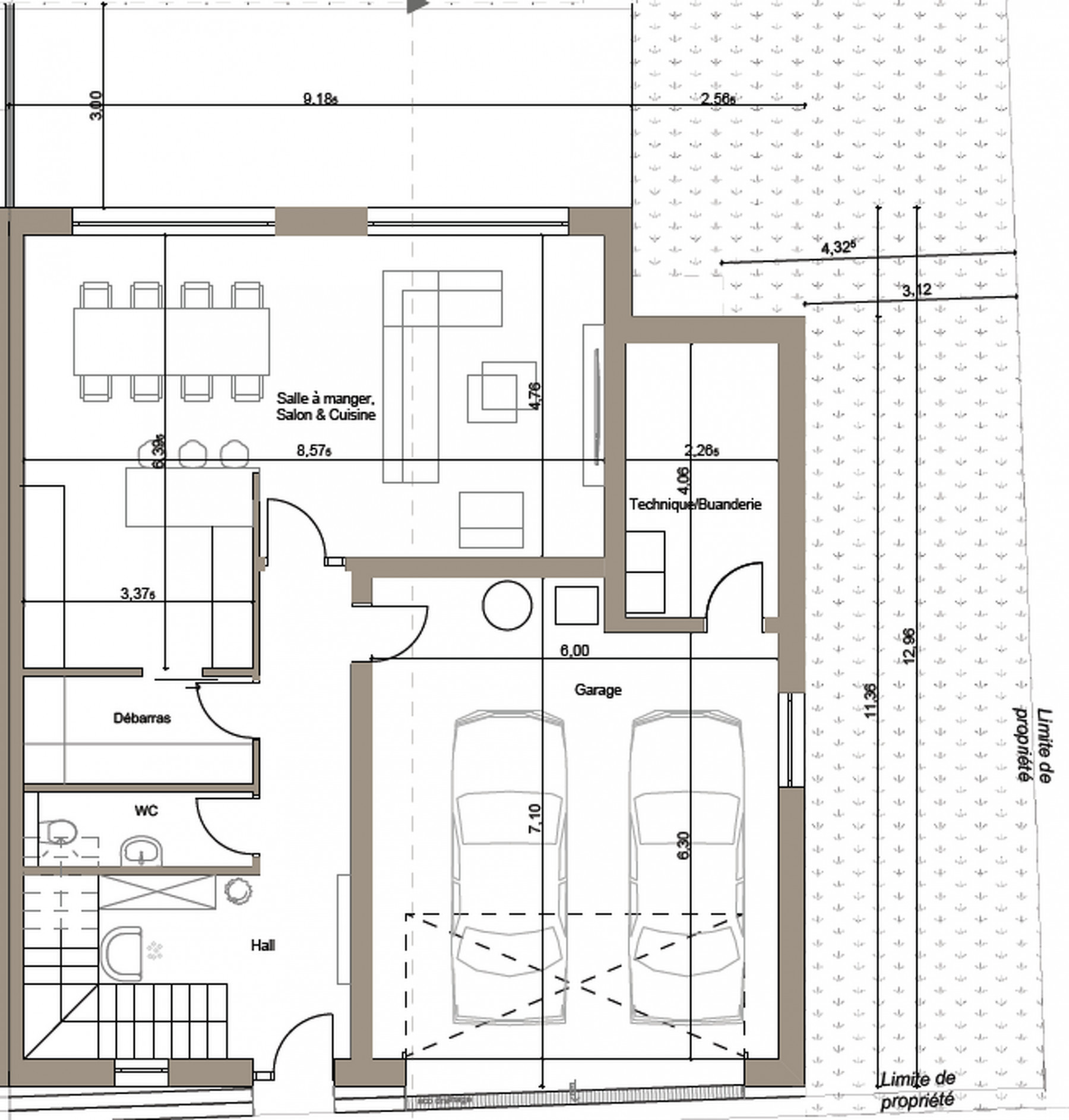 Au rez-de-chaussée, les espaces de vie ont été conçus en open space pour privilégier luminosité et fluidité. Le salon, la cuisine et la salle à manger forment un ensemble généreux de 46 m², complété par un WC séparé, un débarras, ainsi qu'une cave/buanderie offrant de multiples possibilités de rangement. Un double garage vient compléter ce niveau.