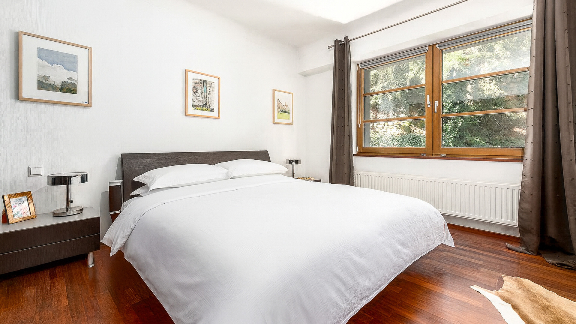 Couloir de Nuit - Chambre à coucher avec salle de douche en suite et vue vers le jardin arboré, Chambre à coucher avec Dressing intégré, Salle de bains avec grande baignoire, douche et double-fenêtre donnant sur le jardin.