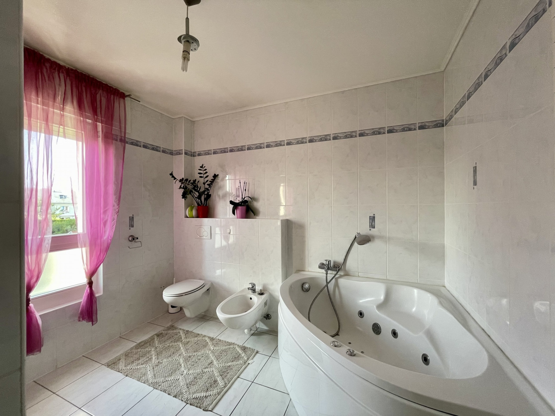 Salle de bain avec double vasque, baignoire/douche à fonction jacuzzi, bidet et WC