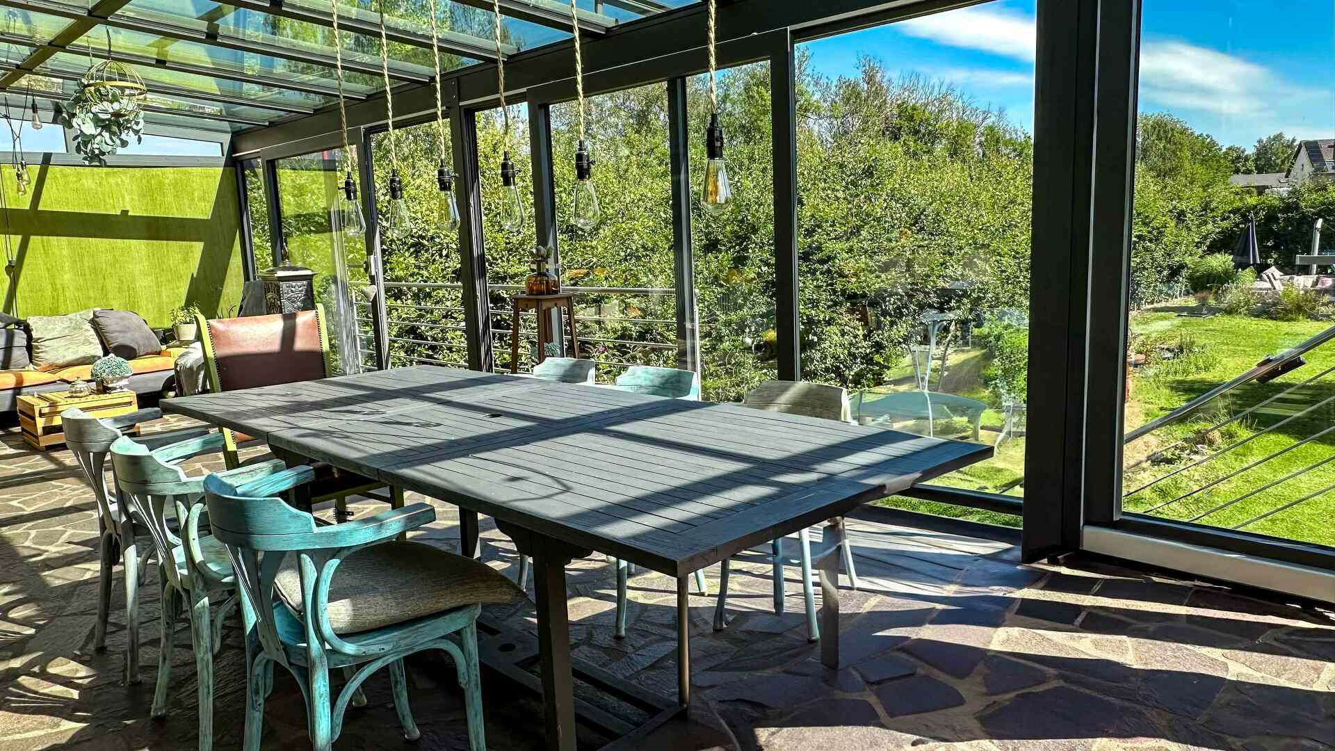 - Séjour confortable et lumineux avec accès à une grande véranda vitrée, ouvrant sur le jardin