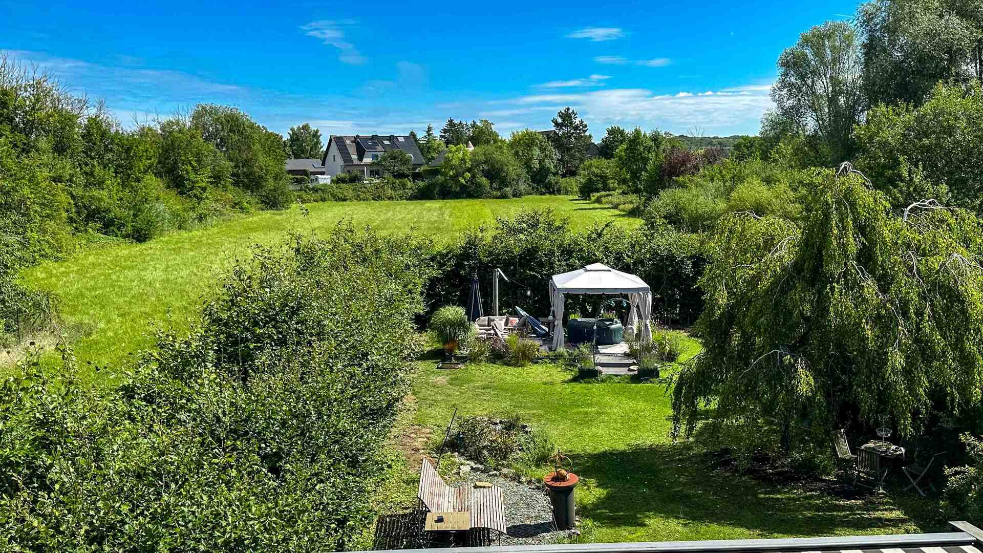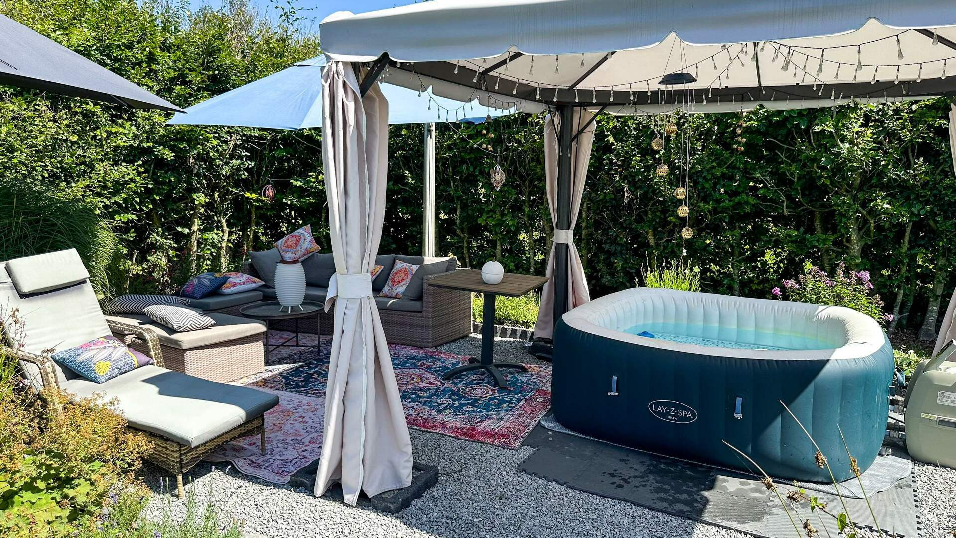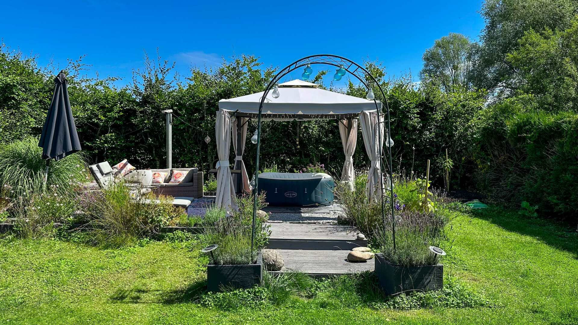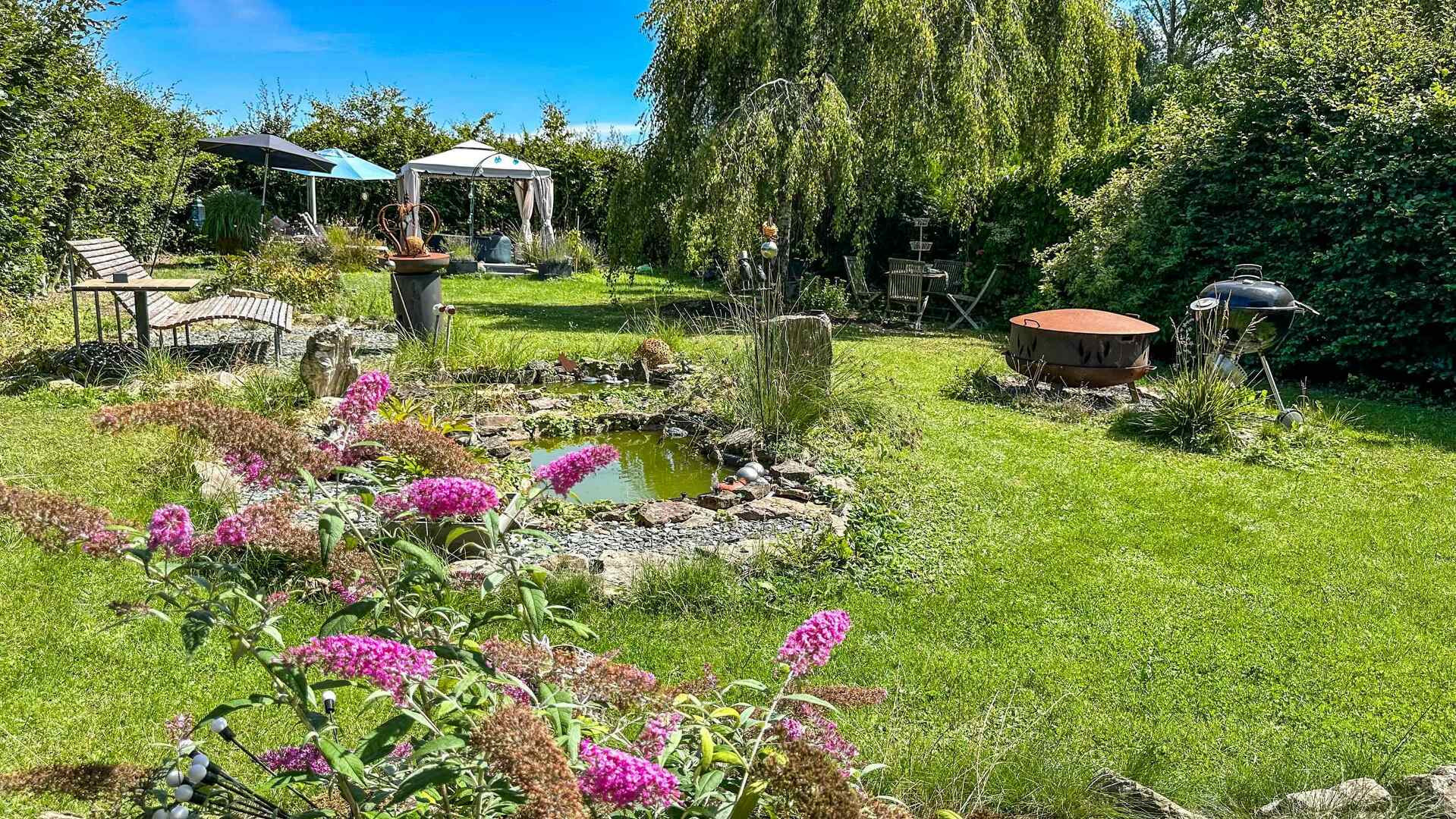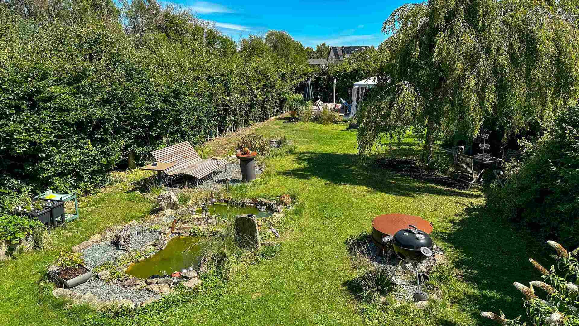 - Jardin allongé avec pelouse, arbres, petit étang et espace terrasse en gravier, idéal pour coin détente ou spa